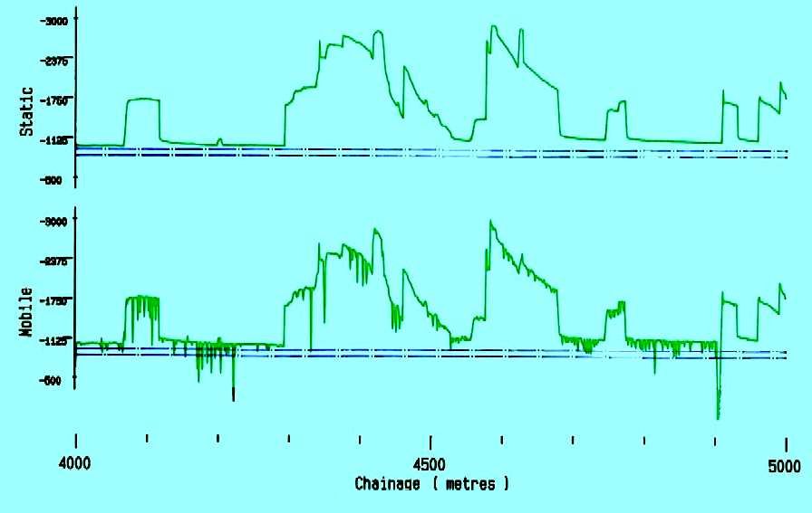 Following trackside remedial work, the commissioning of the Tees-Wiske CP system was authorised. As part of the commissioning procedure, the natural electrical potential profile of the pipeline was determined by an over the line survey, a baseline survey. The natural corrosion potential of steel (Fe/Fe2+) in the ground on a copper sulfate electrode (CSE) scale is measured between 500mV to 700mV, with CP subsequently achieved at potentials more negative than 850mV (CSE). As can be seen from the data (Tees-Wiske pipeline data), normal CP criteria are achieved, albeit erratically, over the majority of the line, without the system having been energised. However, this survey revealed quite startling effects, with the natural potential of the line varying in the range of 0.8V and 3.0V (as measured on the CSE scale). The initial consideration for the cause of such potentials was that a stray current was entering the line from the current return circuit on the ECML. Further investigations revealed that whilst DC potentials of up to ~-3V were being experienced, an AC potential profile which peaked at ~-25 to -30V (CSE) was also present on the line. |